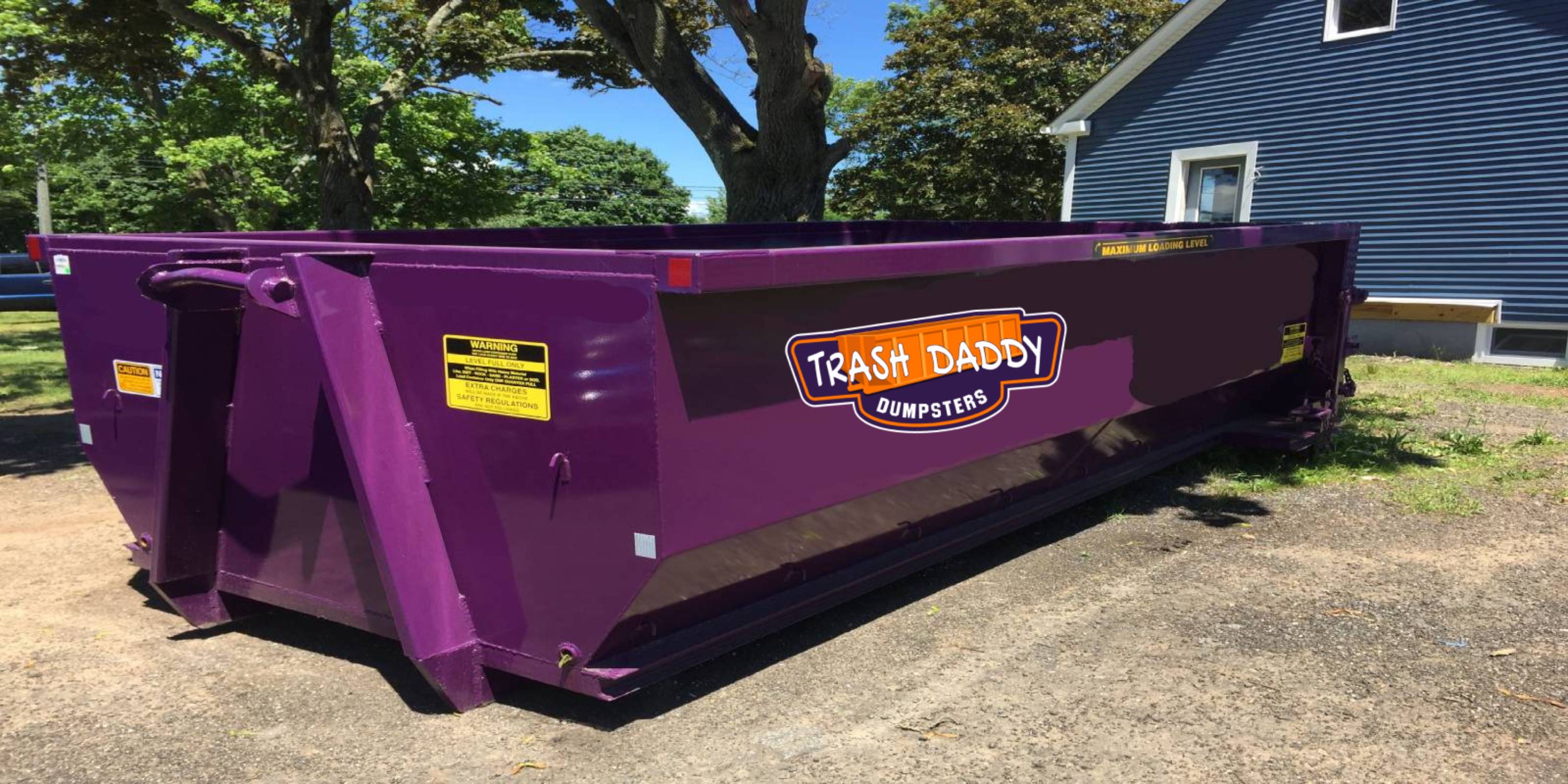 Purple 20 yard roll-off dumpster from Trash Daddy Dumpsters placed in a driveway